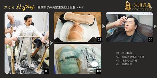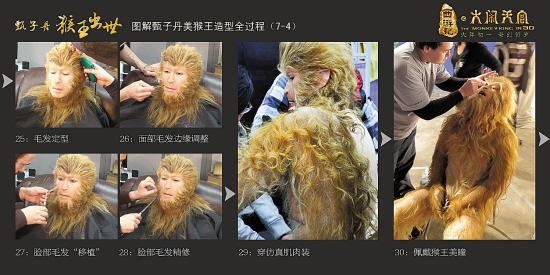 变身“美猴王”可不是吹一根毫毛那么简单的事。所有工序包括:脸部表情扫描、全身翻模、全身数据化分析、牙齿定位倒模、脸部皮肤制作、假耳设计制作、额头皮肤黏贴、鼻翼皮肤黏贴、下颌皮肤黏贴、假耳黏贴、皮肤边缘修饰、手部特效妆化、脸部喷枪化妆、唇部精细化妆、眼部细节妆容、戴毛发头套、前额毛发黏贴、毛发定型、脸部毛发“移植”、装猴王牙齿、佩戴猴王美瞳、穿仿真肌肉装、毛发及妆容整理、穿美猴王战甲、戴雉羽花翎……晕了没?