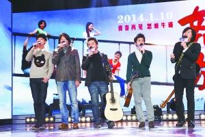 图为卢庚戌、李健、缪杰、老狼、左立(从右至左)演唱电影《怒放:青春再见》主题曲。