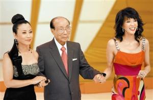 2007年10月4日,邵逸夫在汪明荃(左)、郑裕玲(右)的陪同下出席香港无线电视四十周年台庆亮灯仪式。 (资料图)