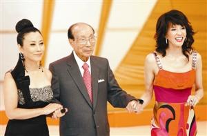 图为2007年10月4日,邵逸夫在汪明荃(左)、郑裕玲(右)的陪同下出席香港无线电视四十周年台庆亮灯仪式。