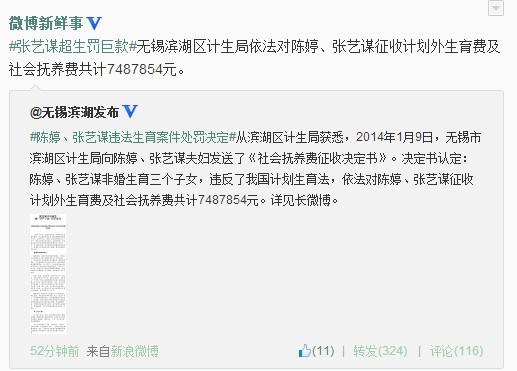 无锡滨湖计生局:张艺谋超生罚款7487854元