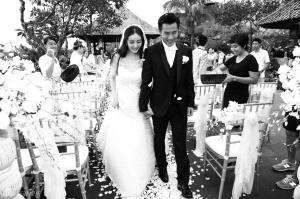 昨日,杨幂与刘恺威在巴厘岛举行婚礼,双方父母和亲朋好友在场见证了这一时刻(如图)。圈内人中只有唐嫣以伴娘身份出席,整个流程按最简单的西式婚礼操办。宣读誓言时,杨幂含泪说:“我将毫无保留地爱你。”(记者 何佳穗)