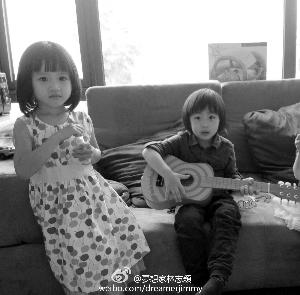 林志颖在微博上贴出kimi给Cayla弹吉他的照片。