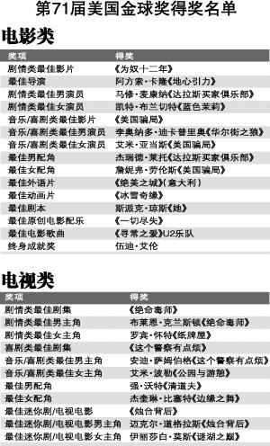 《绝命毒师》此次收获分量最重的剧情类最佳剧集奖,“老白”布莱恩·克兰斯顿也凭借《绝命毒师》获得剧情类最佳男主角,“毒师”粉对此赛果相当满意。此前布莱恩·克兰斯顿在艾美奖男主角的角逐中意外输给了《新闻编辑室》主演杰夫·丹尼尔斯,此次拿到金球奖,布莱恩感慨:“这真是结束这个剧集的最好的方式。”