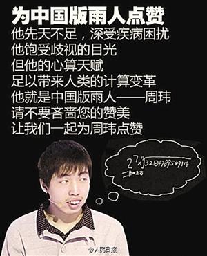 1988年上映的奥斯卡最佳影片《雨人》是影迷心中经典,达斯汀·霍夫曼演绎了一位具有超强记忆力和心算能力的智障人士。而上周五的《最强大脑》则让大家见识到具有超强数学天赋的“中国雨人”周玮。可留给大众的震撼和感动还未散去,“打假斗士”方舟子又跳出来了,他怀疑周玮现场算出的结果是强记下来的,并质疑是“电视台找了一帮骗子在那里装有超能力”。对此,节目组回应“欢迎一切质疑节目的人来挑战”。