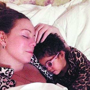 ▲ 美国歌手玛丽亚·凯莉抱子入睡,萌娃着豹纹装戴镜框十分炫酷。