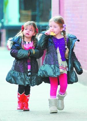 《欲望都市》女主人公凯莉的扮演者杰西卡·帕克的双胞胎女儿扎着麻花辫,在街上边走边吃十分可爱。