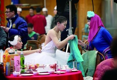 没有更衣室,草根演员们在餐厅里将就更衣,但也同样快乐 本版摄/法制晚报记者 林晖