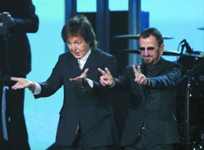 在颁奖礼上,前甲壳虫乐队成员保罗·麦卡特尼(左)和林戈·斯塔尔向观众致意。 新华社/路透