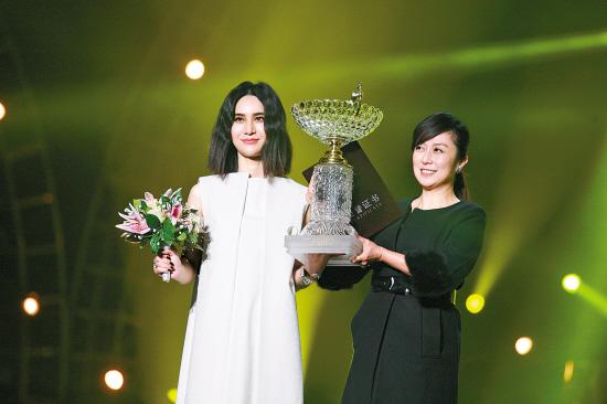 尚雯婕从黄韵玲手中接过“歌后”奖杯