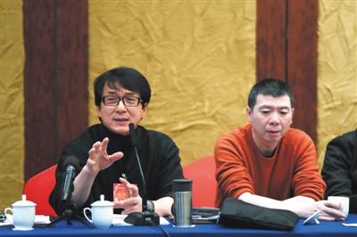 昨日,政协文艺组小组讨论会上,成龙委员发言时感慨在内地手续复杂,办事难。(记者 薛珺 摄)
