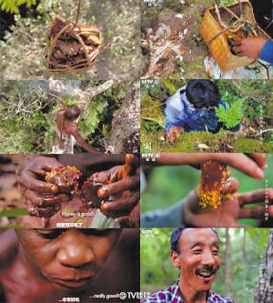 《舌尖2》一开始讲述了藏族小伙白马占堆为弟弟采集野蜂蜜,要攀爬相当于10层楼高的大树,这个镜头在BBC纪录片《人类星球》第4集中,就有非洲土族攀爬百米大树采蜜的场景。于是,网友纷纷表示有抄袭之嫌。从镜面截图来看,爬树、仰望、摘蜜的镜头都很相似。