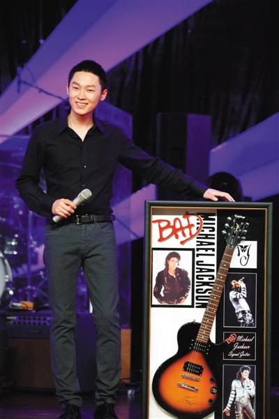 梁博一回来就收获颇丰,得到了公司董事赠送的有迈克尔·杰克逊签名的吉他。 新京报记者 郭延冰 摄