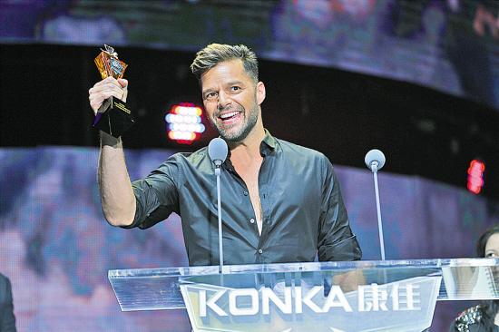 另一位国际巨星瑞奇·马汀,则让观众大饱耳福。这位“拉丁王子”以深领黑衣搭配白色紧身裤,潇洒依旧,在台上献上了2014年世界杯主题曲《Vida》的亚洲首唱。此外,瑞奇还演唱了一首《Come with me》。在获颁“亚洲影响力最受欢迎国际艺人”大奖时,瑞奇用中文大呼:“我爱你!”