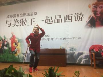 “敢问路在何方?路在脚下……”27日上午,著名表演艺术家、82版电视剧《西游记》孙悟空的扮演者六小龄童,来到成都图书馆展开了一场公开演讲。在两个小时的演讲中,六小龄童完全脱稿,他笑称:“我跟孙悟空思维一样,天马行空,想到哪里说到哪里。”六小龄童既“讲”又“演”,在畅聊西游文化之余,还现场表演了美猴王的一些经典表情和动作,甚至大耍“金箍棒”,赢得满堂喝彩。