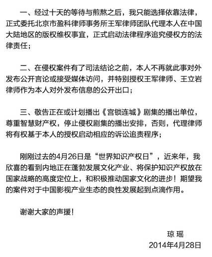 琼瑶控诉于正涉嫌抄袭事件再度升级,2014年4月28日,琼瑶在《花非花雾非雾》的官方微博上发布声明称,将正式提告于正侵权:“我决定委托专业律师控告《宫锁连城》观剧侵权方,诉诸法律维护《梅花烙》的版权权益。 ”同时,对于正在或计划播出《宫锁连城》剧集的播出单位,委托代理律师将有权基于琼瑶的授权启动相应的诉讼追责程序。对此,湖南卫视或也将被追究责任。