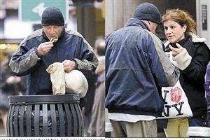 左:基尔扮流浪汉拣垃圾吃。右:女游客送食物给基尔。