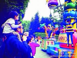 4月25日,孙俪在微博晒出邓超背着儿子游香港迪士尼的照片。