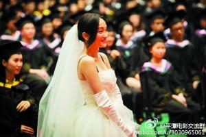 周迅希望年底能和男朋友结婚,图为她在新片《我的早更女友》中穿婚纱的剧照。