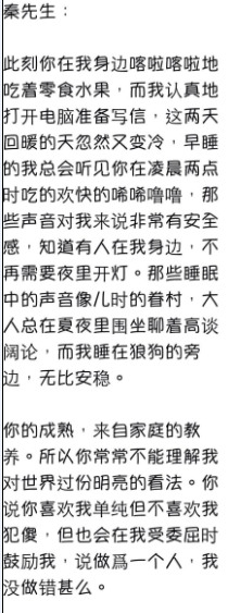 伊能静说,自己曾经问过秦昊,为什么他以前天天出去玩?对方的回答是“因为家里没人”。再问为何现在不去了?“你斜眼看我,彷彿我有多笨,你说现在家里有人,就不玩了。因为你不爱说话不爱笑,那平淡的表情对我丰富爱笑爱哭的我来说实在很陌生,所以我总怀疑你是不是心里有事?结果你打了个哈欠说,天生就长这样跟心里无关”。寥寥数语,可见伊能静与男友的感情之深。