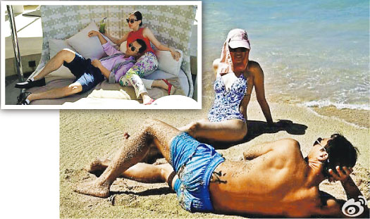 甄子丹与妻子晒太阳 腰部"诗"字纹身抢镜(图)