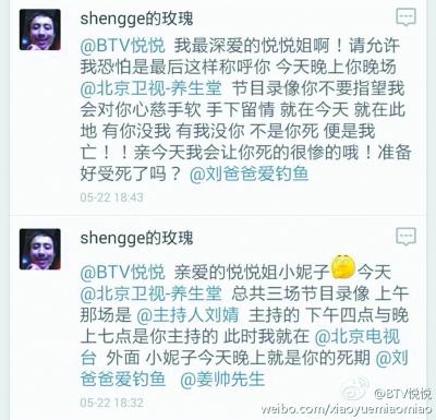 昨晚8点,北京电视台主持人刘洪悦通过“BTV悦悦”实名认证微博曝光了骚扰者“shengge的玫瑰”对她人身威胁的微博信息,“shengge的玫瑰”在5月22日连续发表两篇威胁信息,骚扰者在第一条信息中称:“BTV悦悦,我亲爱的悦悦小妮子,今天,北京卫视养生堂总共三场节目录像,上午那场是主持人刘婧主持的,下午四点与晚上七点是你主持的,此刻我就在北京电视台外面,小妮子今晚就是你的死期。”