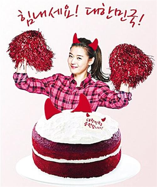 全智贤近日为代言品牌拍摄世界杯主题海报。该品牌推出了世界杯主题蛋糕,全智贤头戴红魔球迷标志性牛角发卡,变身球迷。