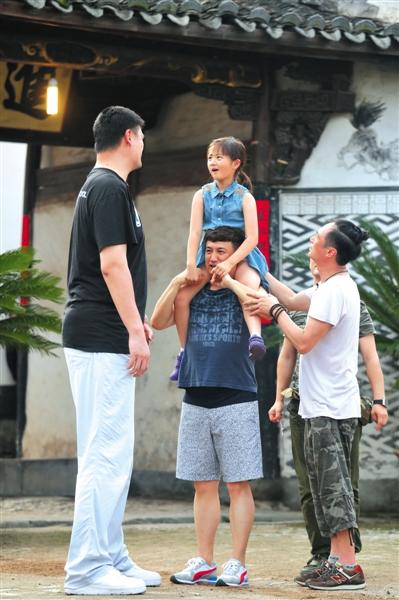 黄磊的女儿多多坐在爸爸身上和姚明比高。