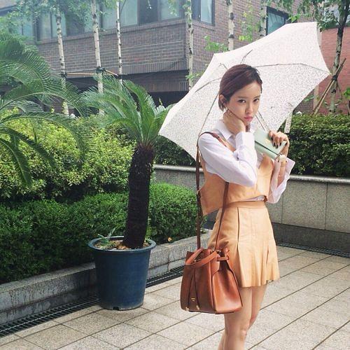 公开的照片中,孝敏身穿白色衬衫,外搭造型别致的奶茶色短上衣和同色系短裙,肩挎复古牛皮包,手里拿着薄荷色的钱包,碎花雨伞更是增添小清新气质。