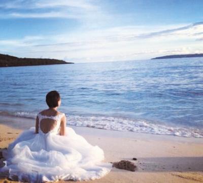 王珞丹穿露背婚纱坐在海边。
