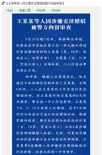 中新网9月15日电 据北京警方透露,9月10日晚,接群众举报,48岁陕西籍电影导演王某某在北京东城区某小区嫖娼被抓。警方通过查明证实,王某某于8日、9日、10日连续三次嫖娼,其中9日同时与两名女子进行卖淫嫖娼活动。据《法制晚报》证实,这名导演正是拍摄《白鹿原》的王全安。