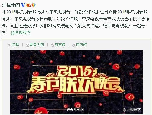 人民网北京9月15日电 (吴亚雄)据央视新闻微博,近日网传2015年央视春晚停办,中央电视台今日声明:好饭不怕晚!中央电视台春节联欢晚会不仅不会停办,而且还要办好。我们将携央视电视人最大的诚意,继续与电视观众一起守岁。