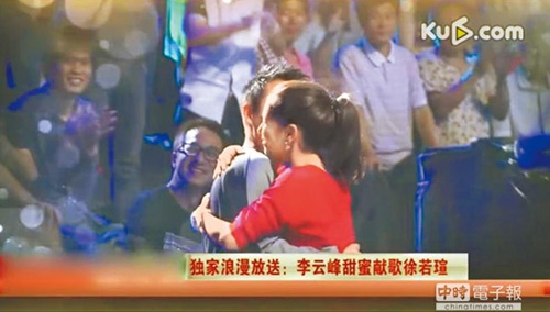 徐若瑄(右)在《梦之声2》和老公李云峰拥抱。图片来源:台湾“中国时报”