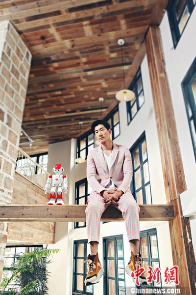 张亮变身“时尚科技男” 与机器人同坐横梁(组图)