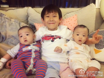 中新网6月29日电 今日下午,范玮琪在微博中晒出双胞胎爱子与另一小男孩的合照,并称“兄弟情”。照片中飞飞和翔翔穿不同衣服,飞飞是红黑色条纹连体服,翔翔的连体服则是米黄色的。两个小家伙萌帅的模样征服了一众网友。