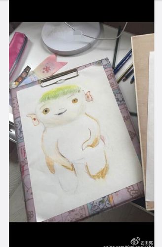 其中一张照片中,森碟穿着白裙,一边看手机一边画一个卡通人物,表情十分认真。而另一张照片中是已经完成的画作。
