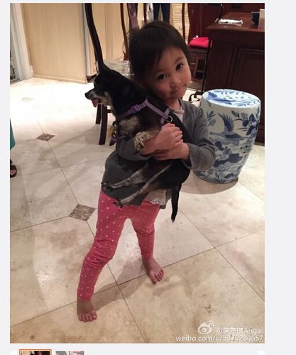 中新网6月30日电 昨晚,李小鹏妻子李安琪在微博晒出两张爱女奥莉怀抱小狗的萌照。照片中,奥莉穿着粉色波点裤,光着双脚站在地板上,怀中抱着一只黑色的小狗,看起来十分呆萌。