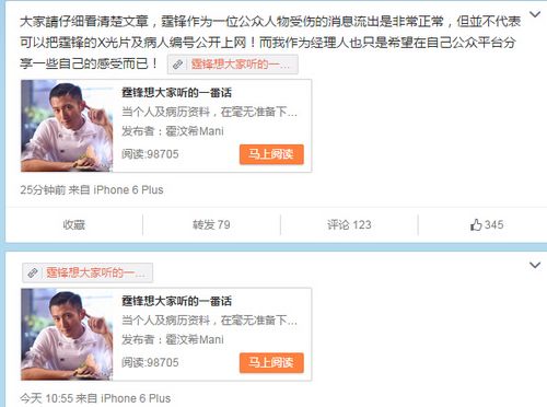 今日上午,霍汶希发布了一条题为《霆锋想大家听的一番话》的长文,文中称,“当个人及病历资料,在毫无准备下在网络疯传,心情比手指的痛更痛!不明白为何近年公众把好奇心变成一个理由,可以肆无忌惮的把别人证件号、个人资料等隐私铺上网,并且成为引以为荣的一件事,完全忽视道德!扭曲观念!其实每个人都有隐私也拥有保护隐私的权利,希望尊重自己尊重别人,停止侵犯隐私行为!不要让这种流行现象变成民族的惯性,不要把科技进步成为道德退步的石阶。——谢霆锋。”