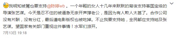 7月13日19点,向华强妻子陈岚在微博发文,力挺陈婷,称:“我明知被骂也要支持陈婷。一个年轻的女人十几年来默默地在背后支持着国宝级的导演张艺谋。今天是忍不住被逼无奈开声支持老公,是因为有人欺人太甚了。合作公司没有片酬,没有分红,最后连电影版权也被吃掉。不止我要支持她,全民都应支持她及张艺谋。望国家有关部门重视这件事情!”