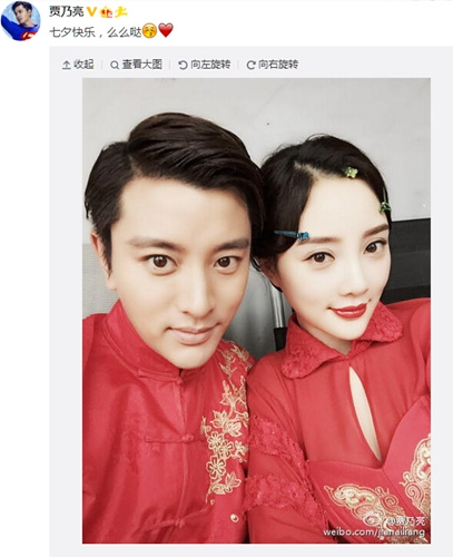 中新网8月20日电 今日是七夕情人节,上午,贾乃亮在微博晒出与爱妻李小璐合影,还留言称“七夕快乐,么么哒”。照片中,夫妻二人都穿着红色的服装,造型喜庆。