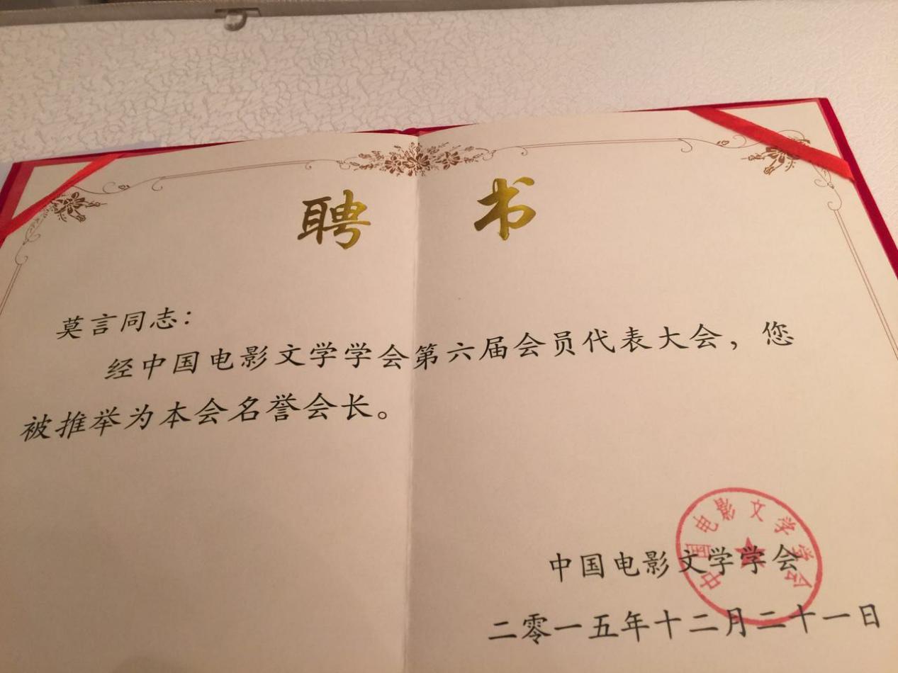 “王兴东会长暨中国电影文学学会全体同仁:欣闻中国电影文学学会第六届会员代表大会召开,在此致以衷心的祝贺。此次大会,我被推举为名誉会长,深感惭愧。希望能为学会尽绵薄之力。预祝诸位同仁创作丰收。预祝大会圆满成功,莫言。”