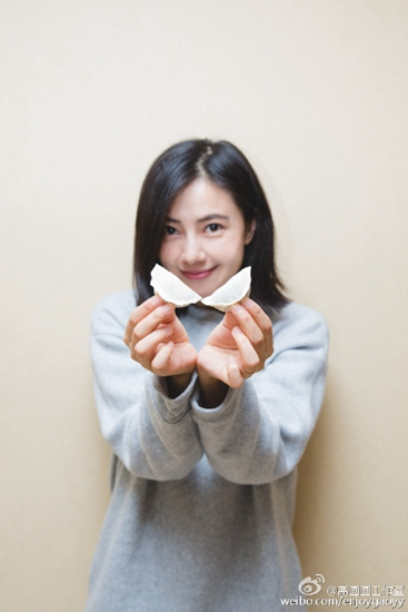 高圆圆举饺子拍照 眯眼卖萌活泼可爱(组图)