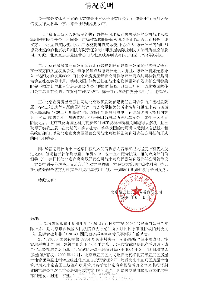 德云社介绍,北京市西城区人民法院法院的执行案件,是因北京宣房房屋经营公司与北京歌舞剧院有限责任公司之间关于广德楼戏院的房屋权属纠纷而起的,德云社只是诉争房屋的实际使用人,并且在使用广德楼期间,德云社已向当时签约的北京歌舞剧院有限责任公司(房屋实际控制方)付清了所有应付款项。