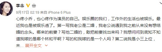 乔任梁因为长期忧郁症自杀,李念也在微博表达很心疼,并也心疼作为演员的自己,因为她最近也是娱乐圈的话题,除了被说老公有结婚过,还说她是小三上位、未婚先有孕,让她气得怒回:“我老公说遇到我之前从来没有想结婚的念头,哪来的前妻?写他二婚的,敢把前妻找出来吗?”