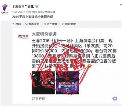 10月26日,王菲演唱会主办方及承办方——上海白玉兰文化艺术发展有限公司的官方微博发布了演唱会售票声明。文中指出此前网络上发布关于演唱会的票务销售属虚假信息,该演出目前尚未公开票价,销售渠道只有大麦网和大麦APP。