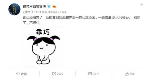 2月20日晚,古装巨制《孤芳不自赏》的官方微博一夜之间沦为水军讨薪阵地,关于“孤芳买水军不给钱”的话题备受关注。大批水军的评论格式统一,口径一致,称《孤芳不自赏》“豆瓣买水军刷好评,做完赖账不付账”,同时还点名了该剧各相关方。在媒体就此事而联系该剧出品方相关负责人时,该剧出品方也正因官博下的评论而一头雾水。随着众多微博认证影视娱乐大号发布微博,对此事进行大肆传播,《孤芳不自赏》剧方终于在官方微博针对此事发出回应:“都已经播完了,还能看到如此整齐划一的壮观场面,一脸懵逼黑人问号.jpg,别炒了,不想红。”
