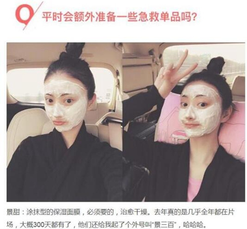 景甜:涂抹型的保湿面膜,必须要的,治愈干燥。去年真的是几乎全年都在片场,大概300天都有了,他们还给我起了个外号叫“景三百”,哈哈哈。