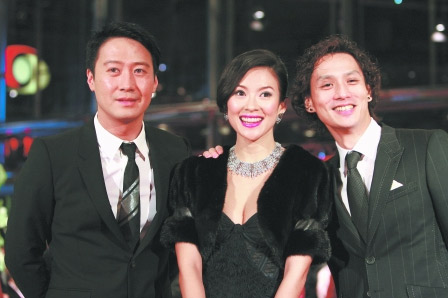 当地时间2月10日晚(北京时间2月11日凌晨),本届柏林电影节惟一的参赛华语片《梅兰芳》在柏林电影宫举行了盛大的欧洲首映仪式。当天柏林的天气并不是很好,《梅兰芳》的红毯仪式还赶上了下雨,但是到场的华人华侨及外国友人还是将最热烈的欢呼声送给了这部“神秘而美丽”的中国电影。片中两位女主角章子怡和陈红无疑是当晚红毯上最耀眼的明星。陈红身穿藕青色的低胸晚装,上镶金色刺绣,非常具有中国特色,而章子怡则延续素雅路线,一身蓝黑低胸晚装搭配黑色皮草披肩,在脖颈千万钻饰的映衬下,显得分外雍容华贵。