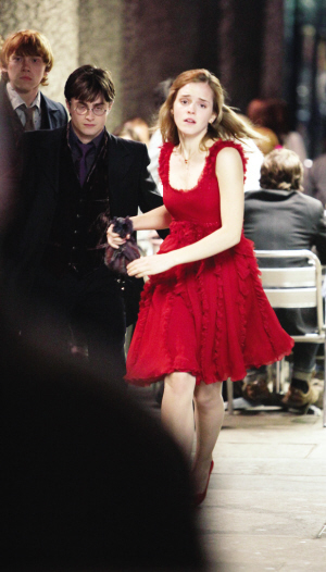 从内容来看,当晚拍摄的主要是“魔法三人组”在咖啡店遭遇“食死徒”追杀的戏份。因为刚从罗恩哥哥比尔的婚礼上逃离,哈利、罗恩都穿着正装,赫敏则是一身耀眼的红色礼裙,神色惊慌的她正匆匆奔跑,寻找安全的藏身之处。
