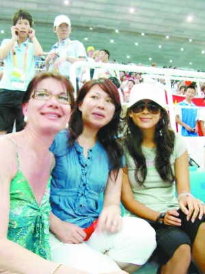 章子怡(右一)在水立方看了跳水,并为郭晶晶加油。